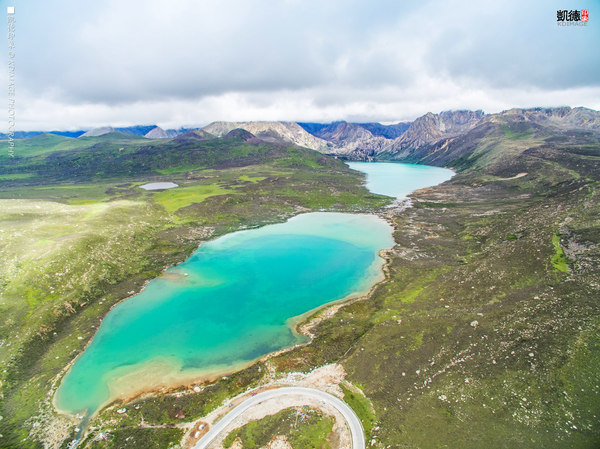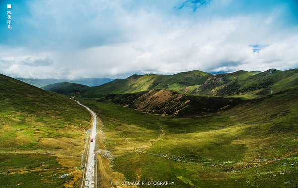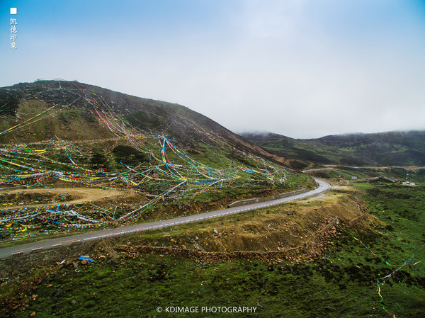 經幡飄揚在這個 五千多米的山口,周圍是連綿的山脈還有雪山。埡口的風很大,氣溫低了很多,在這里連走路都會氣喘吁吁。我們在這個海拔放飛無人機,第一次挑戰這么高的海拔,還是有點膽戰心驚的,幸好還是安全返航。廣闊的綠色草甸和延綿的318國道看著讓人心情舒暢。