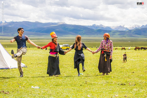 在這樣的美麗草原上,藏民們與我們一起跳舞。雖然語言不怎么通,不過歌聲和笑聲是相通的。