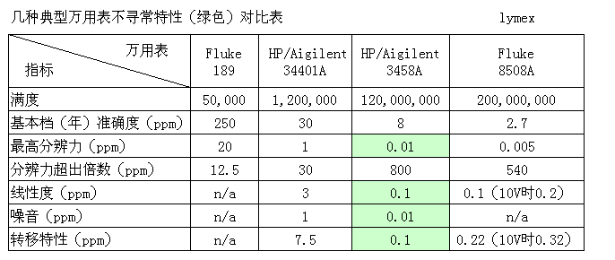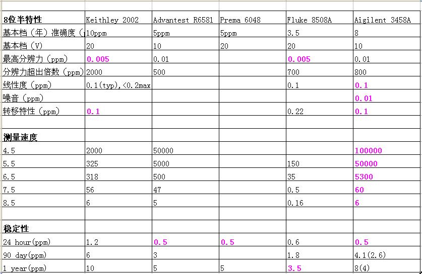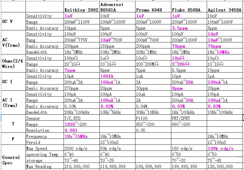 圖9 Advantest R6581 所以現在市面上能見到的在產的8位半萬用表就只有4種: R6581,2002,3458A,8508A 2. 對比 常規參數 這里只對比共同特性,對某一型號特有的功能不做比較。 Advantest R6581 最大顯示1,199,999,999, 可測試DC/ACV,DC/ACI,R,F,T。性能參數大體和Agilent3458A相當。 Keithley 2002 最大顯示210,000,000,可測試DC/ACV,DC/ACI,R,F,T。溫度測試支持RTD,熱電偶兩種傳感器,而且在-200℃~1820℃測量范圍內都保持了最小0.001℃分辨率。但據說其電流檔不怎么樣。 Fluke 8508A 最大顯示199,999,999,可測試DC/ACV,DC/ACI,R,T,不支持頻率周期測量。定位為實驗室參考級別的8508A的確有最寬的測量范圍和最高準確度,尤其是電阻和電流檔。電阻最高支持到20GΩ,電流檔不需要分流器就能支持到20A。但其的缺點是測量速度慢,在8位半模式下需要6秒才能得到一個讀數。 Agilent 3458A 最大顯示120,000,000,DC/ACV,DC/ACI,R,F,可以通過數學運算測量溫度,支持熱敏電阻和RTD。。3458A可謂是經久不衰,在所有8位半萬用表里有最快的反應速度。在長期穩定性上比8508A稍差,但在短期穩定性,線性度,噪音以及轉移特性方面都有最好表現,并提供了極其豐富的數學功能。 表1,基本規格對比
