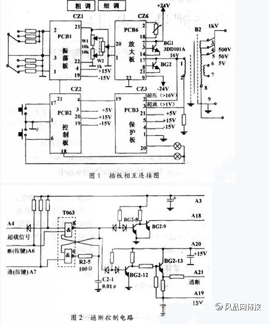 BG6—6、BG6—7、BG6—5、BG6—1、BG6—2,電位器W6—1、W6—2等元件。放大板經(jīng)檢修后插入機中,開啟電源,慢慢調(diào)節(jié)輸出至最大,用萬用表交流電壓檔測輸出變壓器B2初級端電壓應為16V。如電壓正常則排除輸出變壓器的故障。繼續(xù)用萬用表直流電壓檔測量通斷控制板PCB2的端子21對地電壓,開關通時應為+2V,開關斷時為-5V。端子18對地電壓應為+0.2~0.7V(指示燈亮時)或+12V(指示燈滅)。如不正常,可判斷故障源在通斷控制板;如電壓正常,故障可能在振蕩板PCB1。測PCB1的端子21、22之間的電壓應為1.6V,如無電壓,推斷故障原因是振蕩板停振,因而不具備正常的工作條件。繼續(xù)查找振蕩板上的元件,檢查的重點放在振蕩板上的運放BG1—3,壞的可能性極大。如振蕩板起振正常,接著查放大板PCB6的端子20、22之間電壓應為1.6V,若遠小于此參考值或沒有電壓,可以據(jù)此判斷振蕩板PCB1與放大板PCB6的連線開路或短路。查出故障點后進行線路處理或更換元器件。